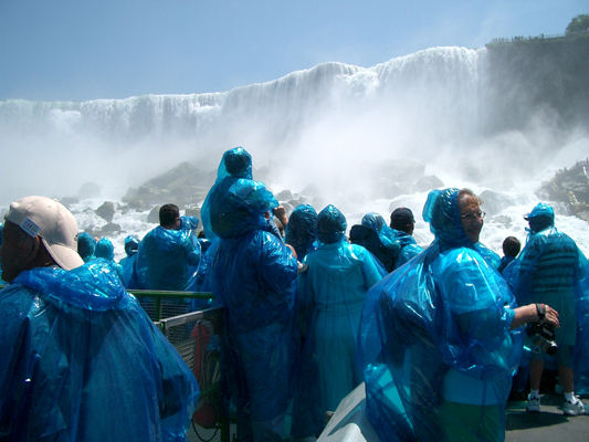 | 観光船のなかの様子。 滝に迫るに従って、観光客にも、 水しぶきが容赦なくかかります。 しかし、乗っている人の多くは、 興奮気味で、わあ〜すご〜い!! ここでは、世界中の人が集まるから、 みんな、グレイト!!って、 感嘆の声をあげ、仲良くなる。 滝つぼ近くでは、土砂降りと轟音で、 なにも見えず、聞こえず!! |