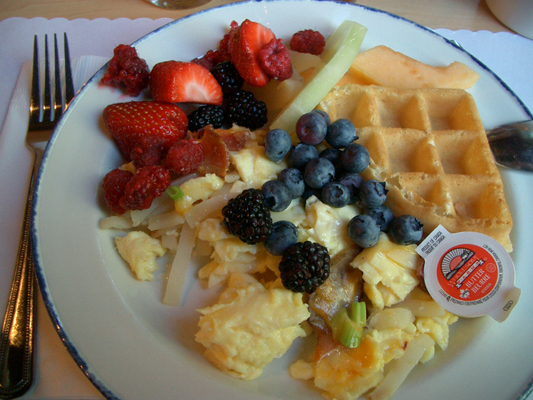 | さて、これは、バンフで泊まったホテルでの、 フルーツたっぷりの朝食です。 今日の朝食に、わたしは、ラッキー!! 副菜はすくなかったけど、 なんと、ベリーやフルーツが、たっぷり☆ 苺、ブルーベリー、ブラックベリー(黒の粒つぶ)、 クランベリー(赤い粒つぶ)。 そのほかに食べたものは、 ワッフルに、バター、ジャム、 そして、スクランブルエッグ少々。 あと、 ウィンナなどは、あまり好きでないのでパス。 |