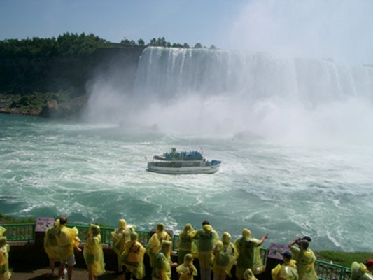 | いよいよ、ナイアガラ最大の観光。 滝のまじかに迫るため、観光船に乗り込みます。 黄色い合羽を着て観光船を見ているのは、 これから観光船に乗る人々。 今、アメリカ滝の前を、 観光船が通過しています。 |